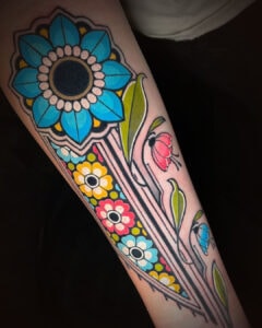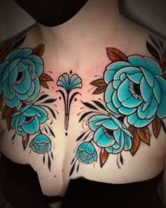 Marrying the allure of Art Deco with the freshness of Neo-traditional styles, Cortney Norton, a seasoned tattoo artist since 2016, delivers vibrant tattoos reminiscent of early twentieth-century aesthetics. Drawing profound inspiration from Art Deco architecture and the captivating advertisements from the Art Deco and Art Nouveau periods, Cortney’s work feels like a delightful dance between the past and the present.