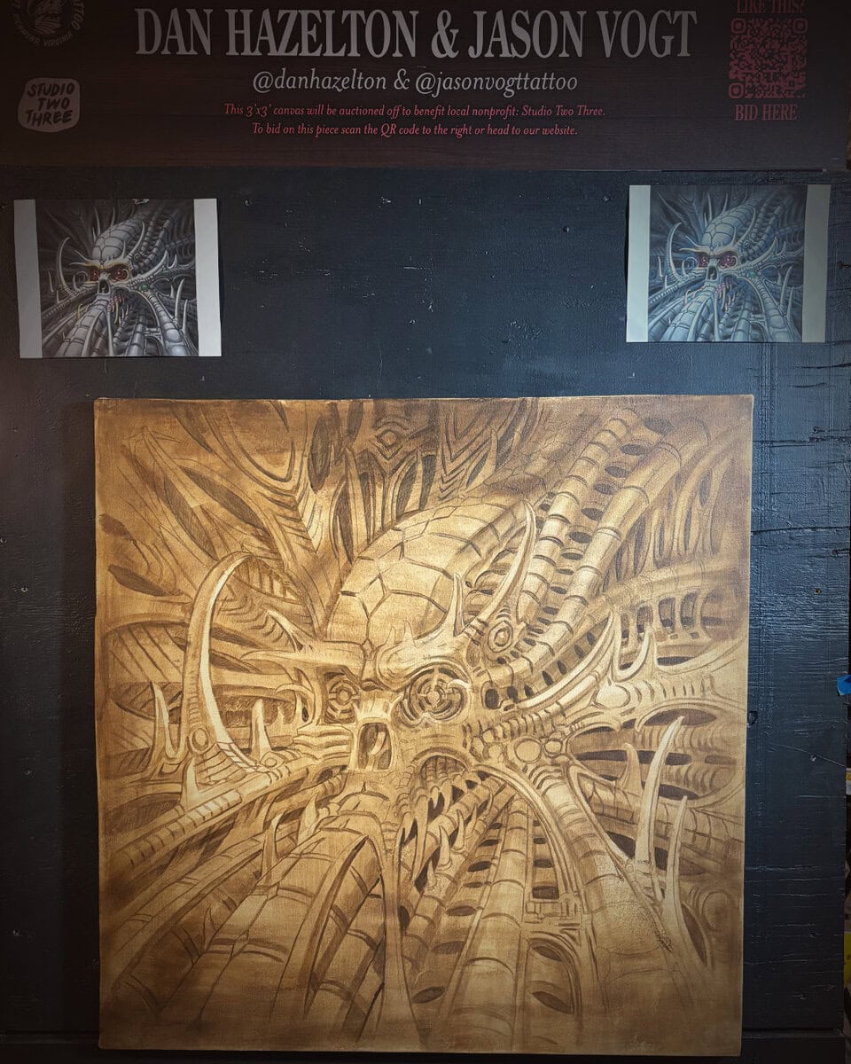 During the convention, Dan Hazelton & Jason Vogt has been working on this special 3′ x 3′ canvas. We are auctioning off this beautiful piece of art to the highest bidder. The proceeds will be donated to this year’s nonprofit partner: Studio Two Three. Studio Two Three is a non-profit dedicated to supplying local artists with a workspace, supplies, tools, and education.