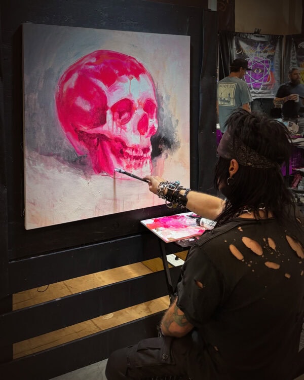 During the convention, Kevin Llewellyn has been working on this special 3′ x 3′ canvas. We are auctioning off this beautiful piece of art to the highest bidder. The proceeds will be donated to this year’s nonprofit partner: Studio Two Three. Studio Two Three is a non-profit dedicated to supplying local artists with a workspace, supplies, tools, and education.